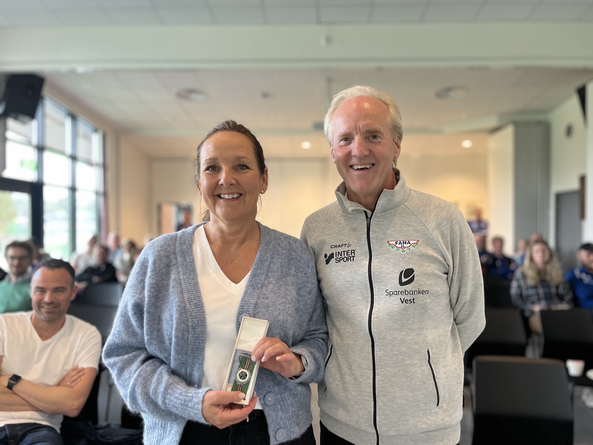 Anita Østerbø ble overrasket på medlemsmøte til Fana IL Fotball da hederstegnkomitéen hyllet henne for sin innsats.